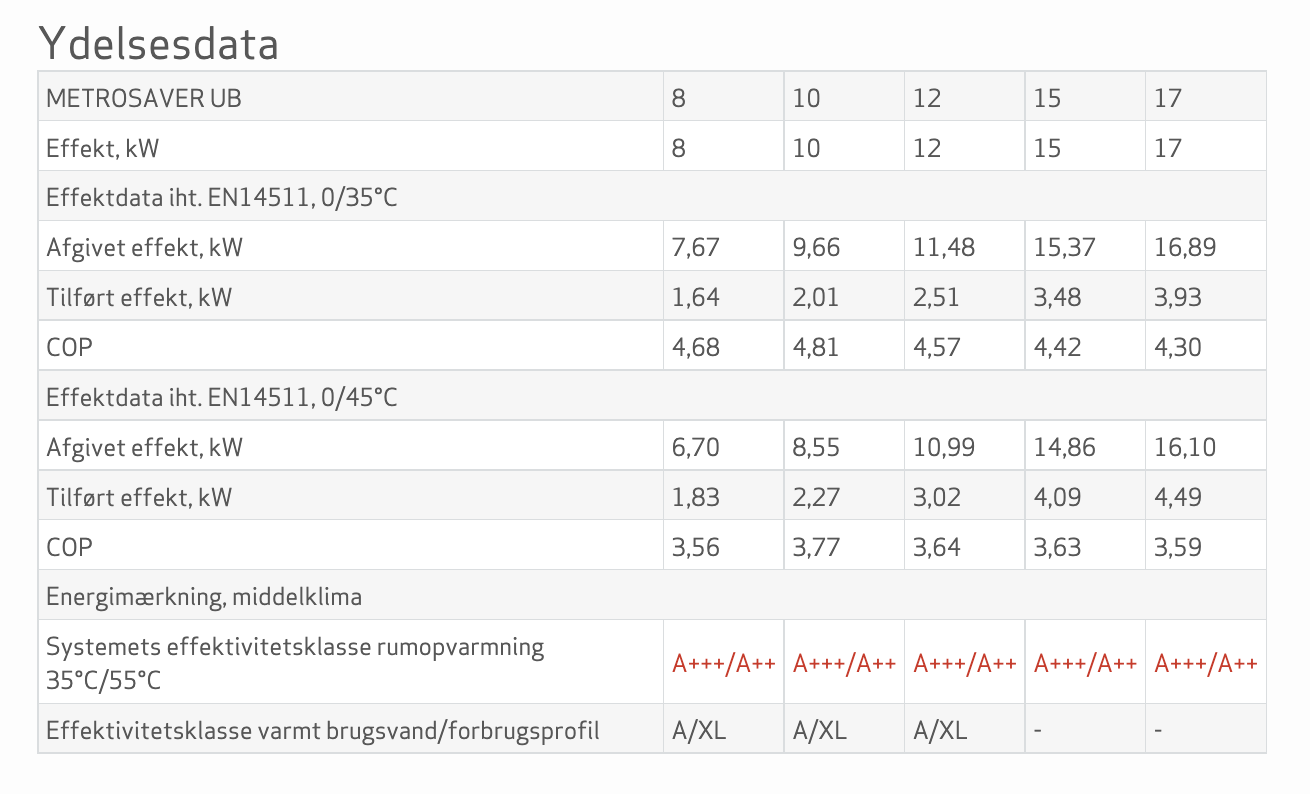 Nedenfor ses ydelsesdatasættet. Her finder du de mere detaljeret målinger og data for Metrosaver UB's forskellige modeller. Derudover har vi også vedhæftet en komplet brochure, en brugerhåndbog og en installatørhåndbog. På den måde har du det fulde overblik, både før, under og efter dit køb af Metrosaver UB.
